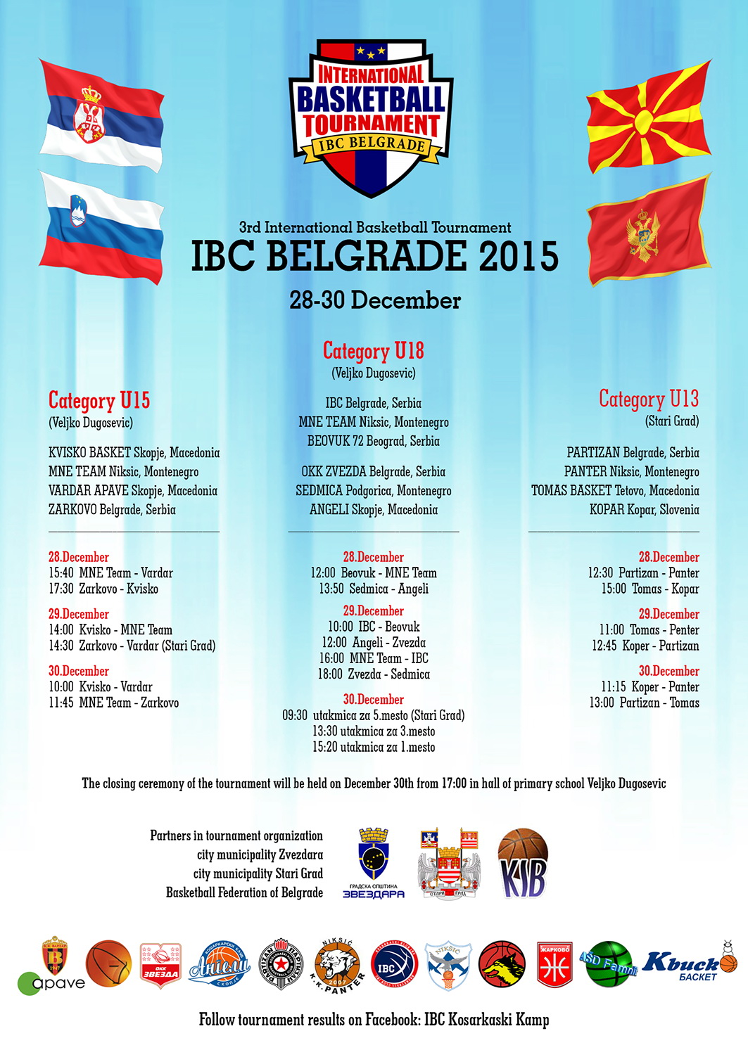 Спортско удружење ИБЦ и Кошаркашки Клуб ИБЦ из Београда, у сарадњи са ГО Звездара, ГО Стари Град и Кошаркашким Савезом Београда, трећу годину за редом организују новогодишњи интернационални кошаркашки турнир ИБЦ Белграде 2015. Ове године турнир ће се одржати од понедељка 28. децембра до среде 30. децембра и окупиће клубове из Словеније, Македоније, Црне Горе и Србије. Турнир се одржава у три конкуренције (пионирска, кадетска и јуниорска конкуренција), а учешће ће узети 14 екипа са око 150 дечака узраста од 13 до 18 година. Од екипа из Србије, поред организатора КК ИБЦ, учествоваће и КК Партизан, КК Беовук 72, КК Жарково и ОКК Звезда. Утакмице се играју у салама ОШ Вељко Дугошевић на Звездари (ул. Милана Ракића 41) и ОШ Стари Град на Дорћолу (ул. Херцег Стјепана 7). Финалне утакмице и свечана церемонија доделе пехара, медаља и признања најбољим појединцима, одржаће се у среду, 30. децембра у сали ОШ Вељко Дугошевић. Турнир ИБЦ Белграде полако али сигурно прераста у највећи и најмасовнији догађај оваквог типа код нас, па тим поводом позивамо све заинтересоване љубитеље кошарке да дођу и поздраве будуће кошаркашке асове.