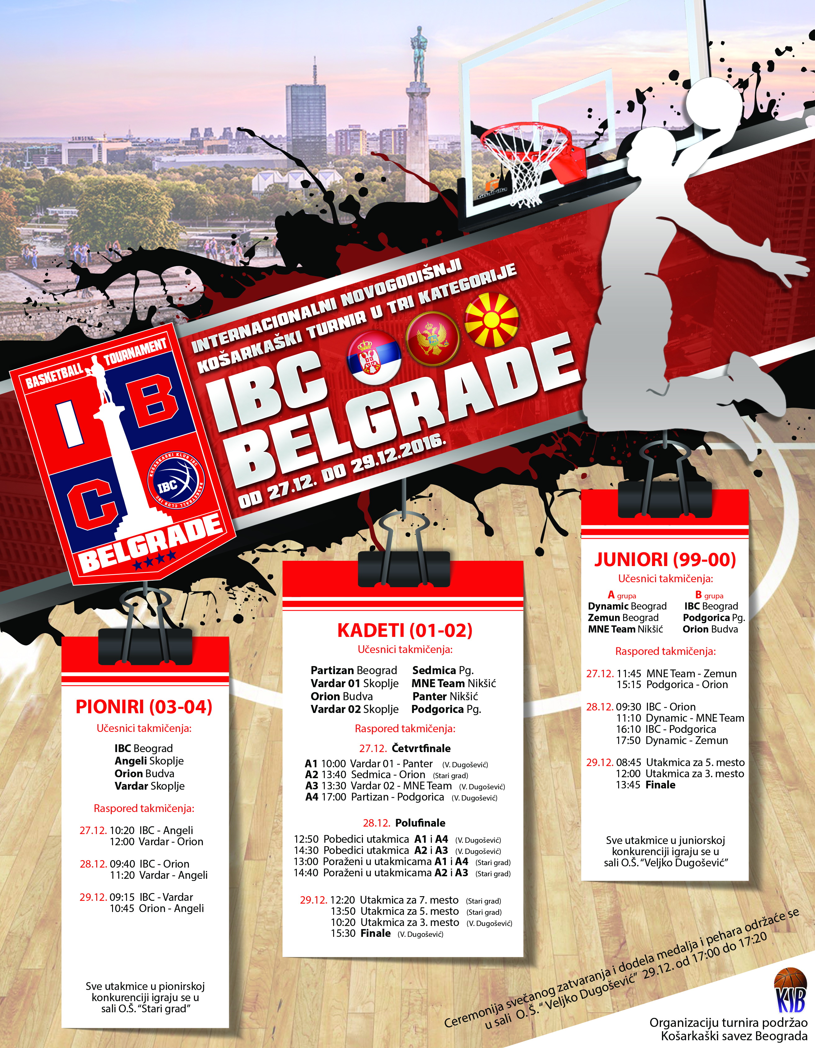 Кошаркашки Клуб ИБЦ из Београда, уз подршку Кошаркашког Савеза Београда, четврту годину за редом организује новогодишњи интернационални кошаркашки турнир ИБЦ Белграде 2016. Ове године турнир ће се одржати од уторка 27. децембра до четвртка 29. децембра и окупиће клубове из Црне Горе, Македоније и Србије. Турнир се одржава у три конкуренције (пионирска, кадетска и јуниорска конкуренција), а учешће ће узети 18 селекција са око 220 дечака узраста од 12 до 17 година. Од екипа из Србије, поред организатора КК ИБЦ, учествују КК Партизан, КК Земун и КК Динамик. Из Црне Горе КК Подгорица. КК МНЕ Никшић, КК Седмица , КК Пантер Никшић и КК Орион Будва. Из Македоније КК Вардар и КК Ангели. Утакмице се играју у салама ОШ Вељко Дугошевић на Звездари (ул. Милана Ракића 41) и ОШ Стари Град на Дорћолу (ул. Херцег Стјепана 7). Финалне утакмице и свечана додела пехара, медаља и признања најбољим појединцима, одржаће се у четвртак 29. Децембра од 15х у сали ОШ Вељко Дугошевић. Турнир ИБЦ Белграде сваке године је све квалитетнији, а по броју учесника може се сврстати међу највеће кошаркашке турнире за млађе категорије на овим просторима. Стога користимо прилику да све заинтересоване љубитеље кошарке позовемо да дођу и поздраве будуће кошаркашке асове.